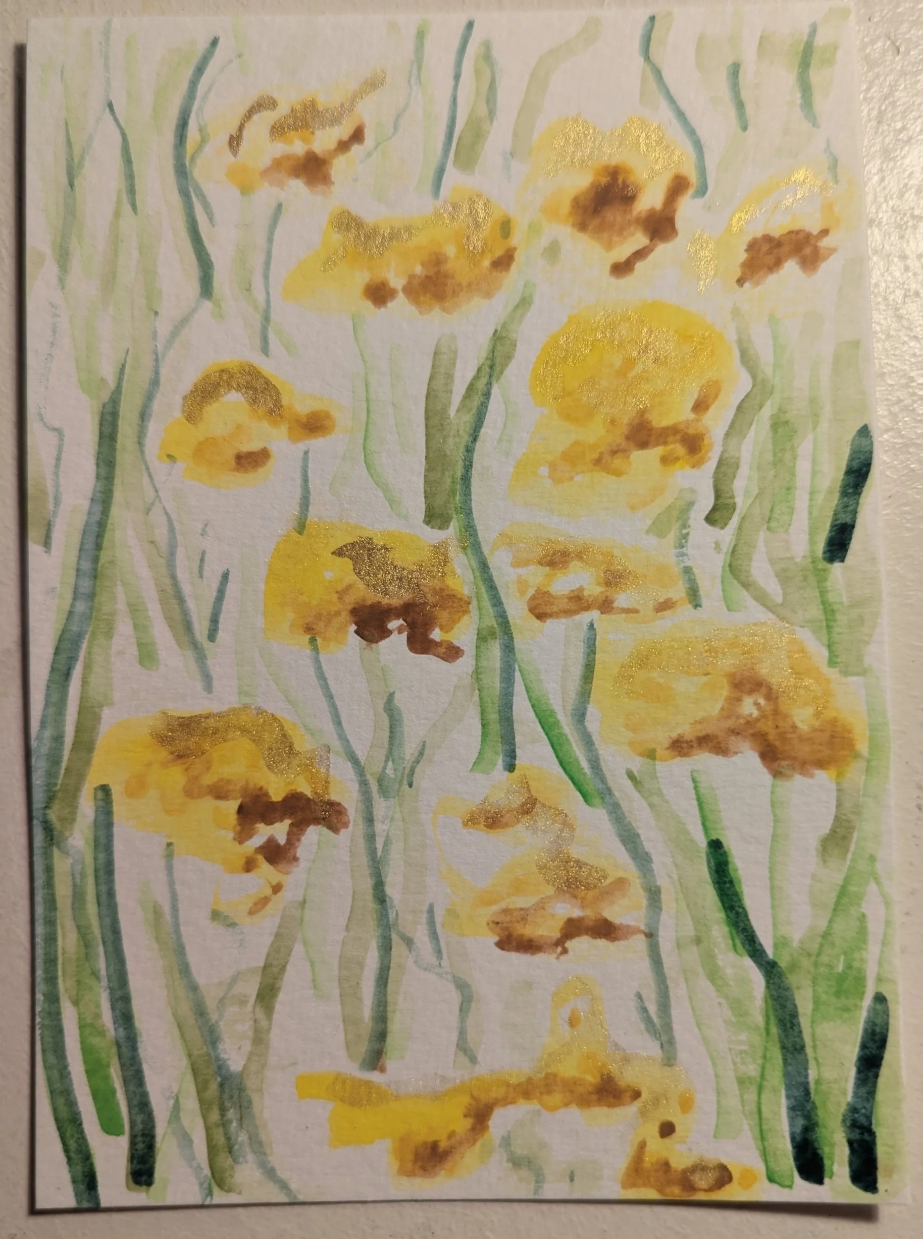 Ian found an inch worm working his way along a twig, and I later learnt that inch-worms are the larvae of moths from the Geometridae family, not their own animal in and of oneself. The yellow straw flowers too were a bright streak against the overgrown grass, and I very much enjoyed painting them later that evening.