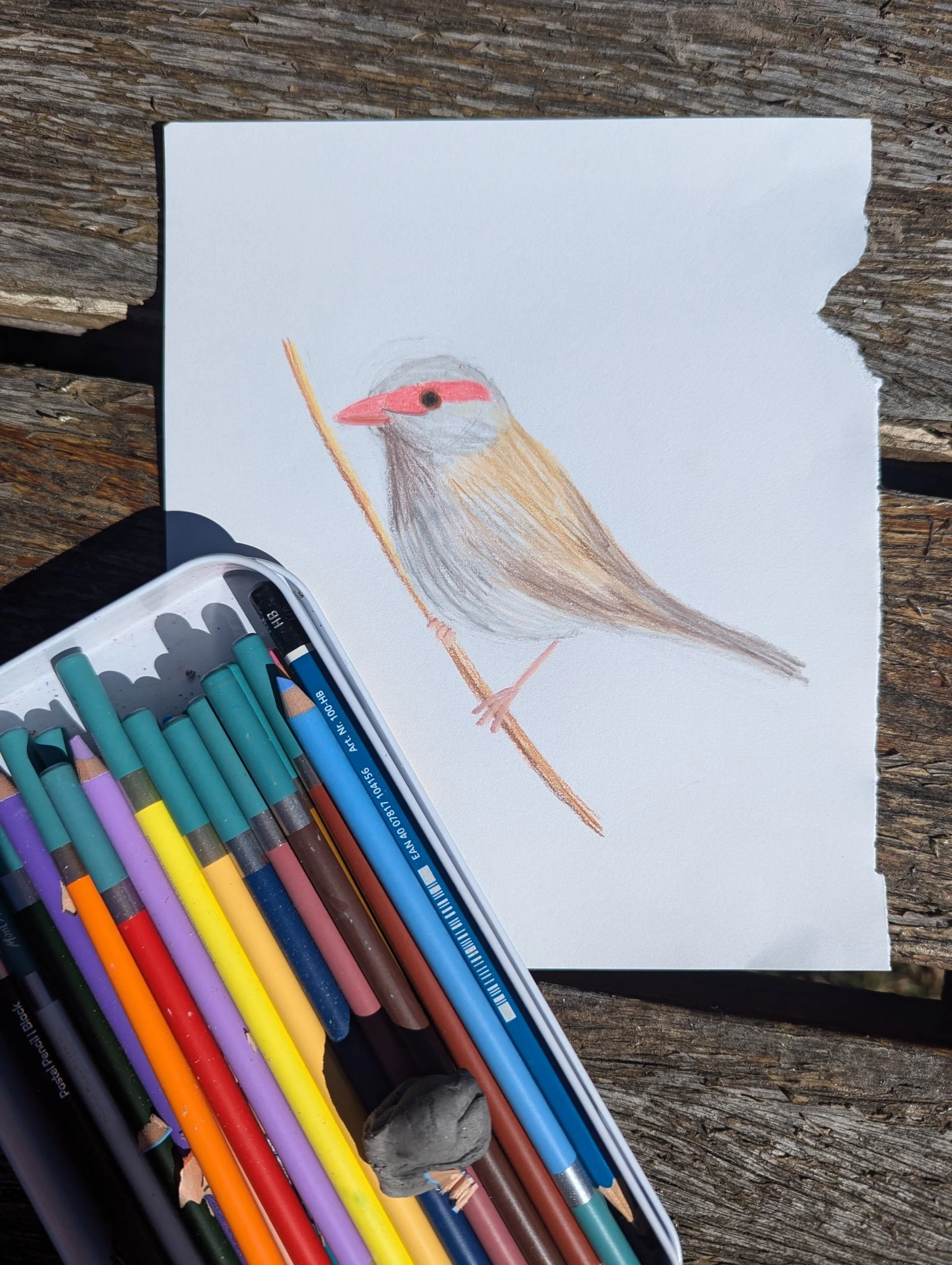 I could hear some twitching and tweets, and started to walk, following the sound of a group of Red-Browed Finches and Superb Fairy Wrens. They have such a distinct sound, almost like little bells. I often hear them come up the street to my yard, and will dive out the door to catch a peek of them before they zoom elsewhere. I ended up walking the length of the reserve, slowly and quietly stalking, hoping to catch a photo of them, though was unsuccessful. In lieu of a photo, I have added to this post a drawing a did of a Red Browned Finch in winter last year for a friend before she moved to Denmark.