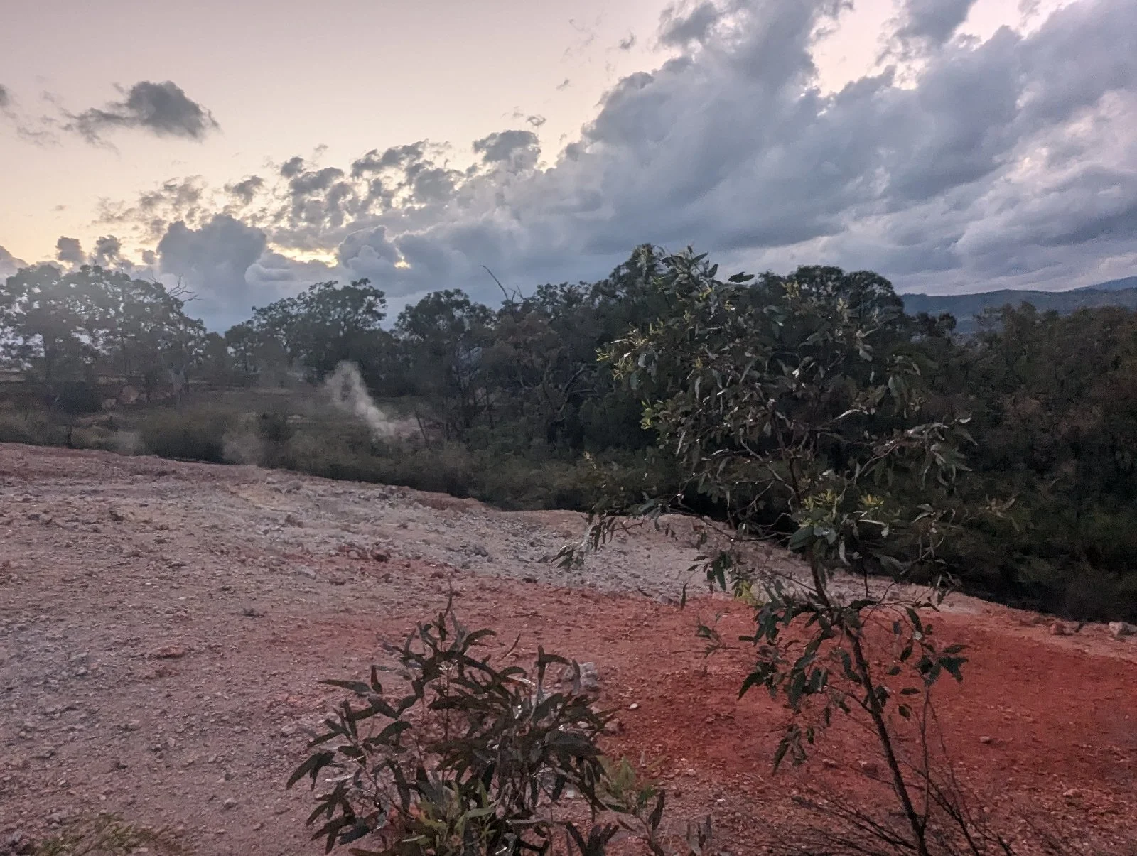 Before us, a gash of red and white marked the greenery, with multiple smoky plumes falling into the sunset. The sulphur rich stench burnt my sinuses, though the swirls and chirps of a Willie-Wagtail alleviated the headache. We could feel the heat from the earth, the warmth pushing against the cracked skin.